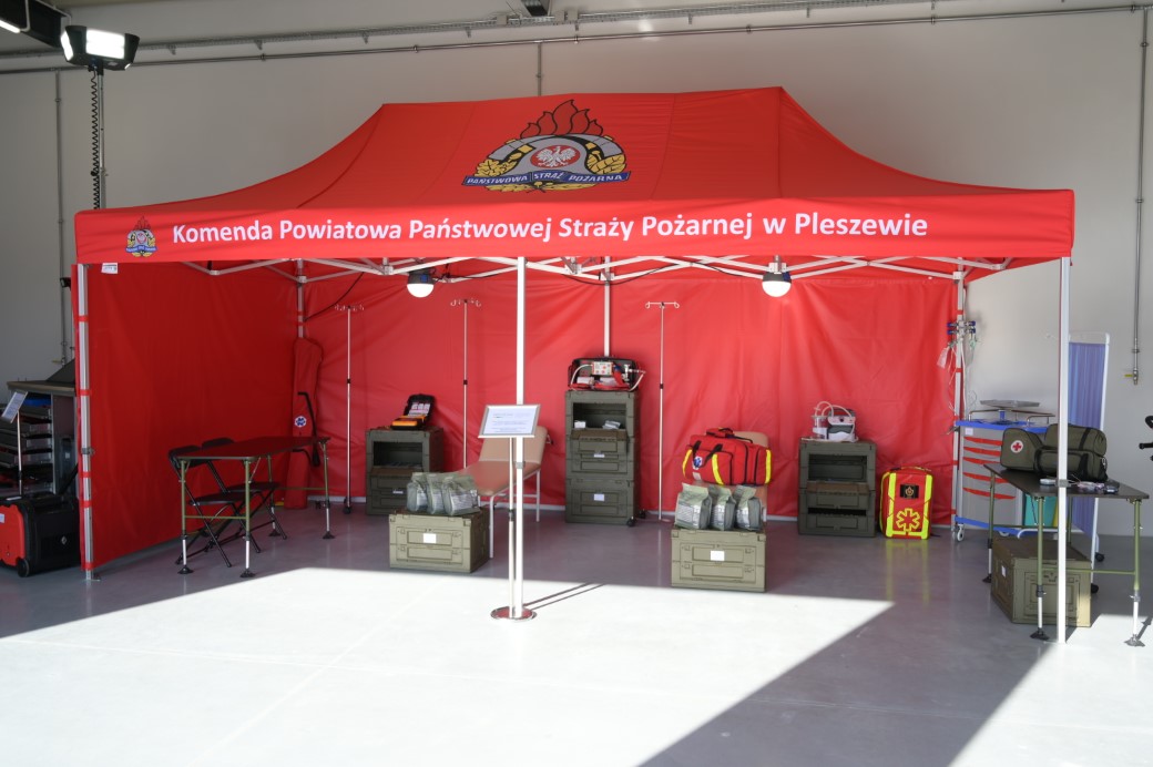 Strażacy zademonstrowali także najnowszy sprzęt i pojazdy, zakupione z Programu Ochrony Ludności i Obrony Cywilnej na lata 2025/2026. Park samochodowy pleszewskiej jednostki powiększył się o dwa nowe pojazdy: średni wóz ratowniczo-gaśniczy (GBA) Renault Trucks z możliwością zaopatrzenia ludności w wodę do celów bytowych (koszt 1,6 mln zł) oraz pojazd ewakuacji medycznej (ambulans, cena 1,2 mln zł) na podwoziu VW Craftera z zabudową kontenerową, wyposażony w sprzęt medyczny według standardu karetki Podstawowego Zespołu Ratownictwa Medycznego (m.in. nosze główne, defibrylator, respirator, instalacja tlenowa, deski ortopedyczne). Zakup pojazdu ewakuacji medycznej podniósł poziom zabezpieczenia medycznego działań, zwiększając możliwości transportu i wsparcia osób poszkodowanych, również w przypadku zdarzeń mnogich i masowych. Straż doposażono także w sprzęt wspierający działania ratowniczo-gaśnicze: oprócz wozu bojowego także armaturę pożarniczą, motopompy pożarnicze, maszty oświetleniowe, pilarki spalinowe oraz mikrofonogłośniki.